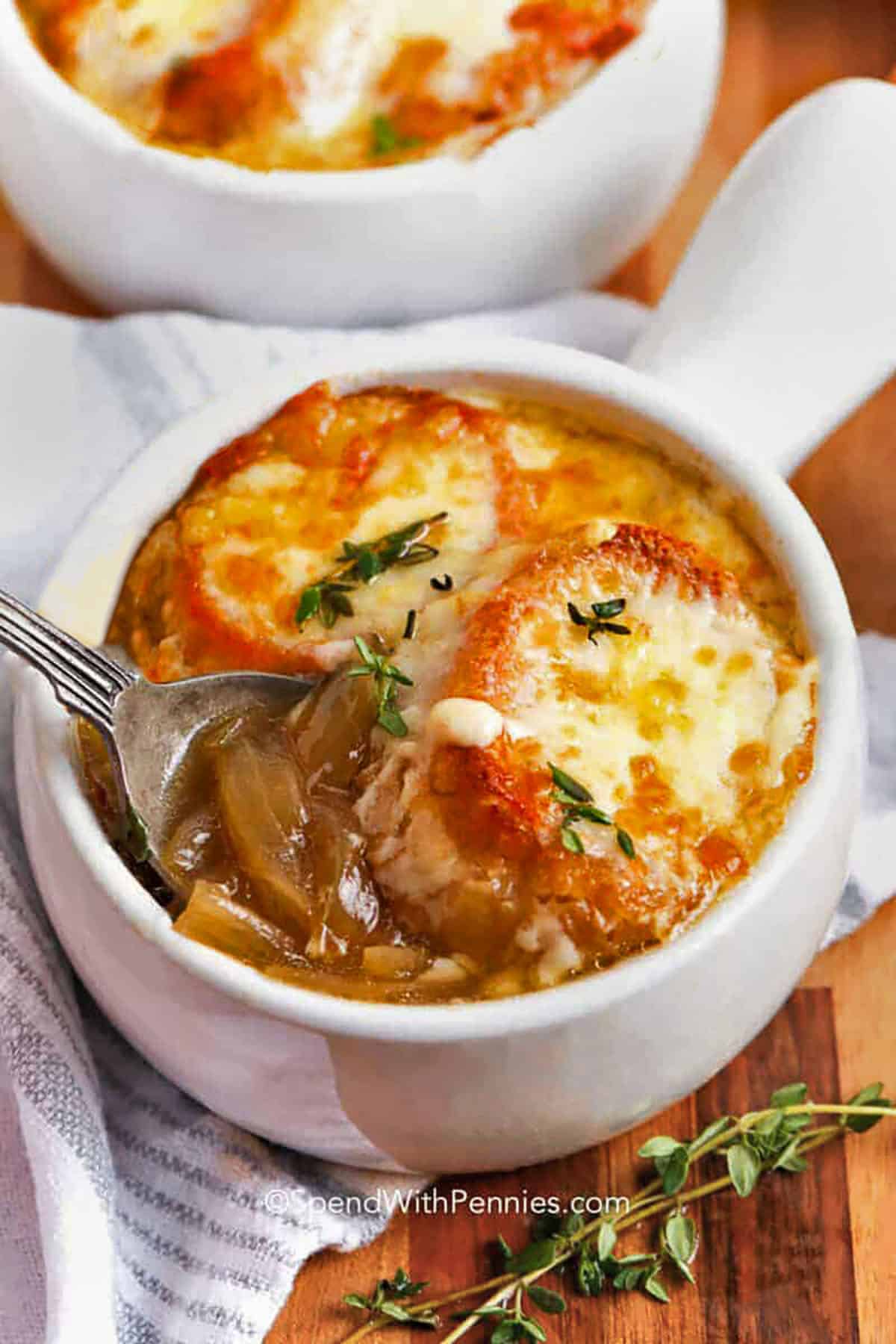Warm, cozy, and full of flavor, this French onion soup recipe is made with caramelized onions, savory beef broth, and melty cheese broiled on top.
