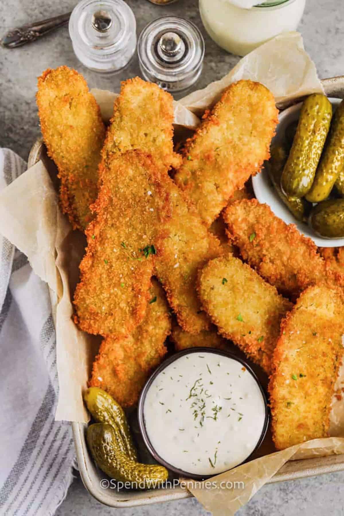 These fried pickles are the ultimate game-day appetizer. A crispy, golden breading is wrapped around tangy dill pickles and perfectly seasoned with garlic, paprika, and a touch of cayenne. Serve with ranch or dill dip for a snack to remember.